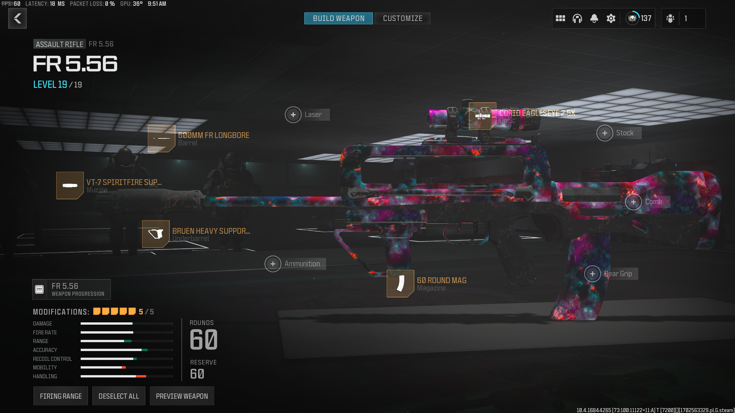 The loadout begins with the VT-7 Spitfire Suppressor and 600mm FR Longbore barrel, both of which increase damage range and bullet velocity and gives a slight boost to recoil control. You really see an improvement in recoil control with the Bruen Heavy Support Grip, though, so equipping that should eliminate most gun kick when firing the FR 5.56.