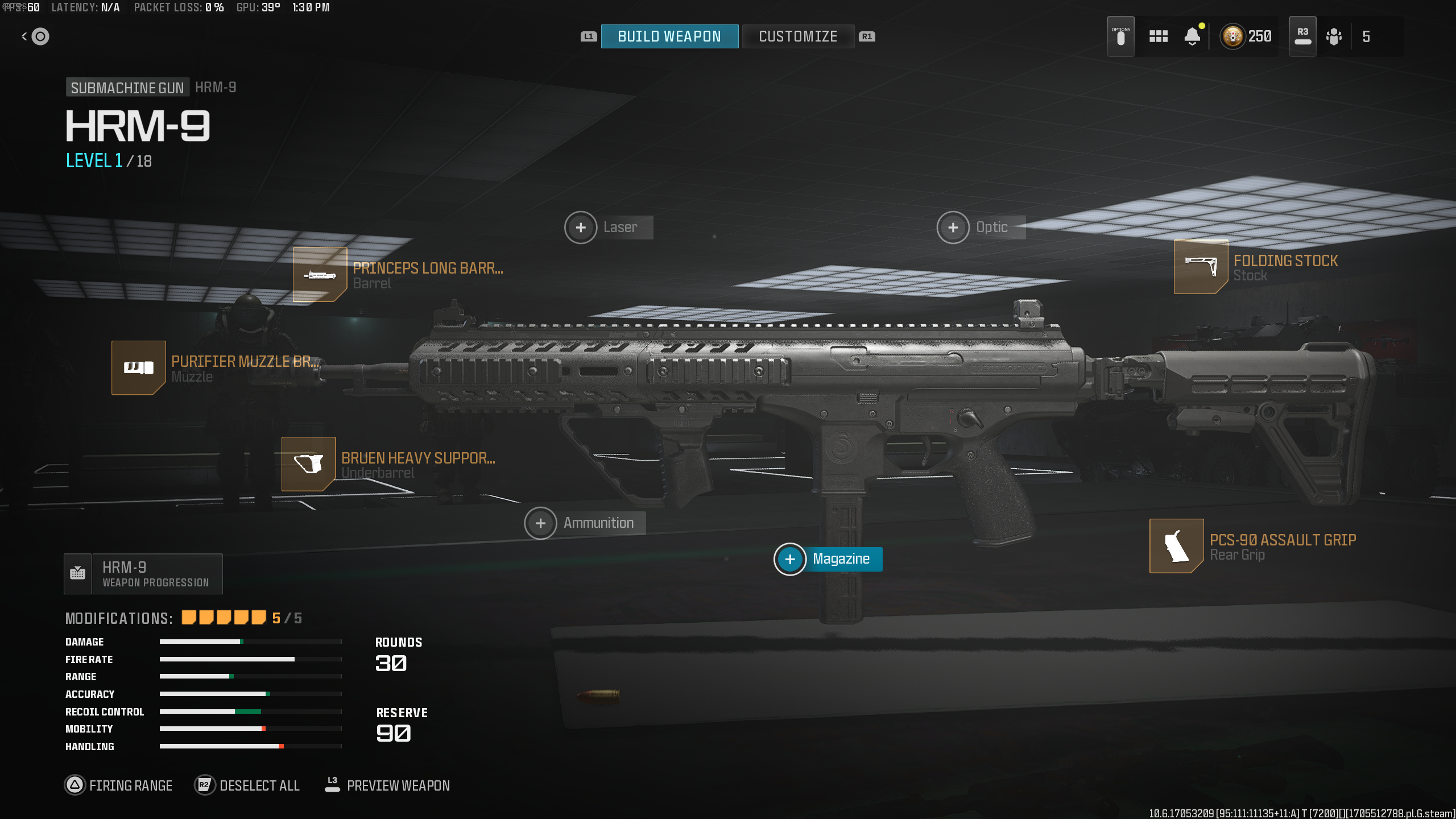 As the HRM-9 has plenty of recoil by default, the main focus of this loadout is to make the SMG more accurate when firing. This is accomplished by equipping the Purifier Muzzle Brake S and the Bruen Heavy Support Grip. Both of these attachments massively cut down on recoil and add some stability to the HRM-9 as well. The Folding Stock and PCS-90 Assault Grip are also in place to help with both of those stats.