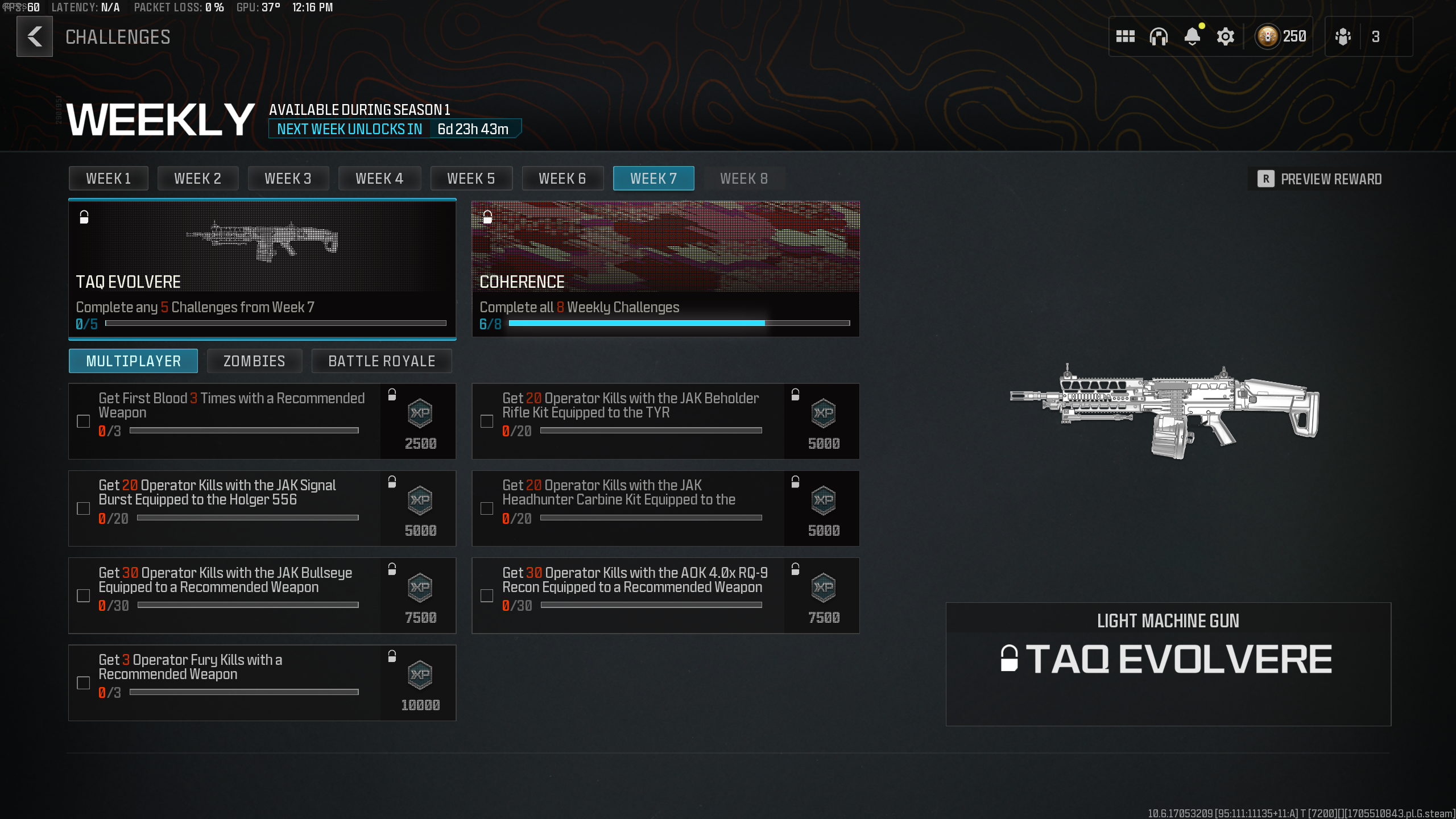 Here, you can see all the various weeks of the Weekly Challenges. The TAQ Evolvere is the reward for Week 7, and it can only be unlocked by completing five of the 15 total challenges in that week. You can choose to complete your challenges in multiplayer, battle royale, Zombies, or mix and match. For example, you can complete two of the multiplayer challenges and three of the Zombies challenges and still unlock the TAQ Evolvere. All that matters is you complete five challenges, it doesn’t matter what mode those challenges are from.